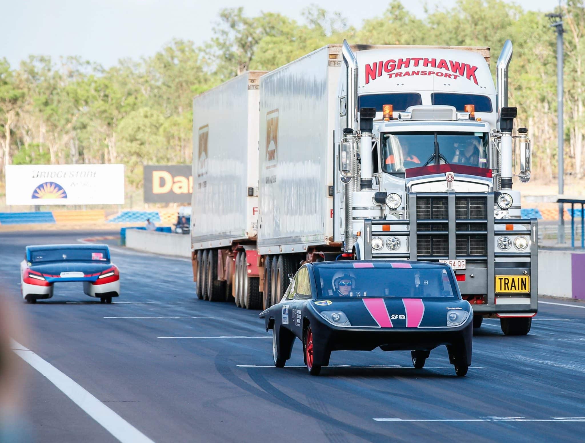 Sharing the road with a road train, Kenworth C509 Takes to the Track with Solar Cars