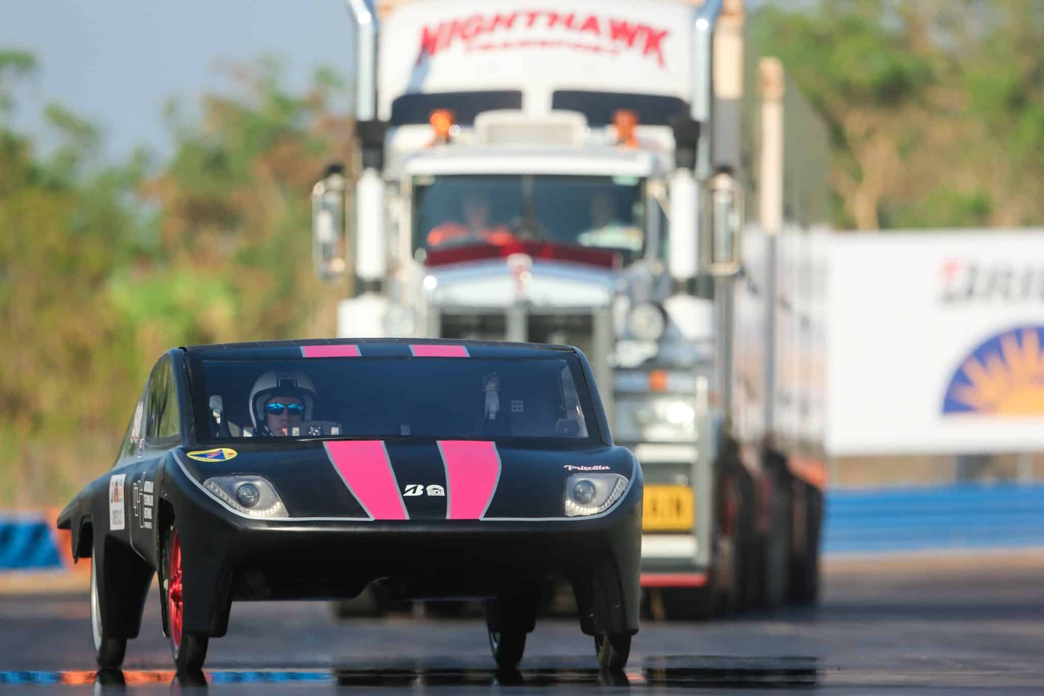 A sparkling, much loved Kenworth C509 road train with its experienced driver and National Road Transport Hall of Famer, Jeff Fulwood, behind the wheel, hit the Hidden Valley racetrack recently with three equally sparkling and-much loved solar cars, ATN Solar Team’s Priscilla, Western Sydney University’s Unlimited 3.0 and Hong Kong team IVE’s Sophie 6 , in a road safety demonstration with a difference.